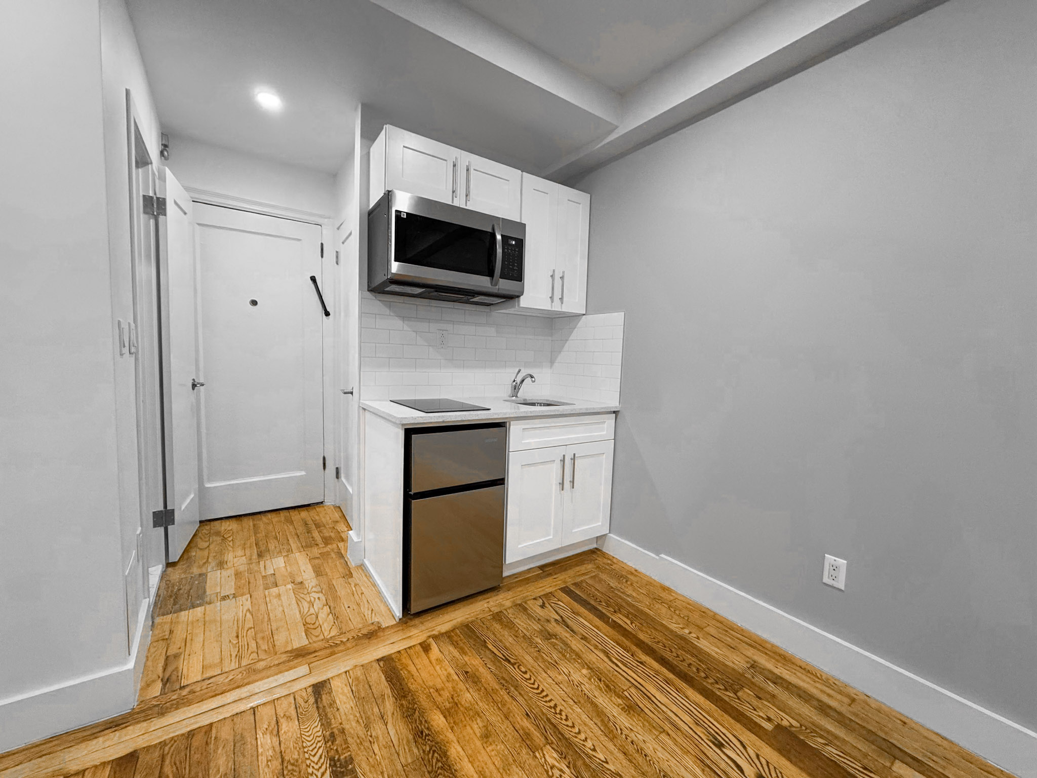 Studio with air conditioner, kitchenette, and bathroom in a 24-hour doorman building with elevator and laundry facility. .